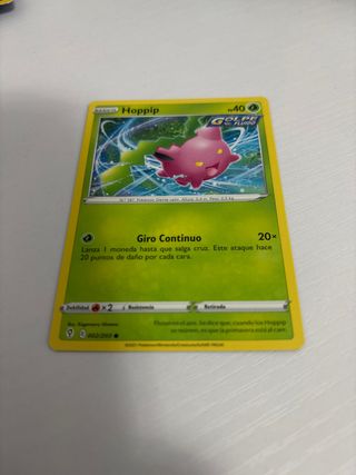 Carta Pokémon de Hoppip, edición básica. - Ataque: Giro Continuo (20x). - Debilidad: x2. - Resistencia:. - Número de carta: 002/203. - Ilustrador: Kagemaru Himeno.