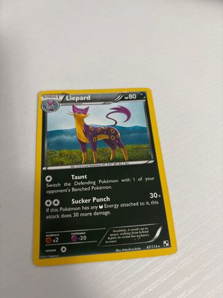Carta de Pokémon del año 2011, con el personaje Liepard. - Etapa: Stage 1 - HP: 80 - Ataque: Taunt - Ataque: Sucker Punch - Debilidad: x2 - Resistencia: -20 - Ilustrador: Mitsuhiro Arita - Número de carta: 67/114