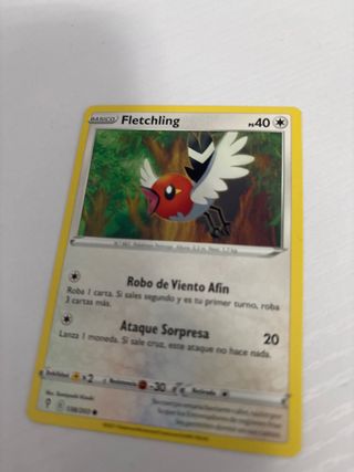 Carta de Pokémon de Fletchling, edición básica. - Ataque: Robo de Viento Afin - Ataque: Ataque Sorpresa - PS: 40 - Debilidad: x2 - Resistencia: -30