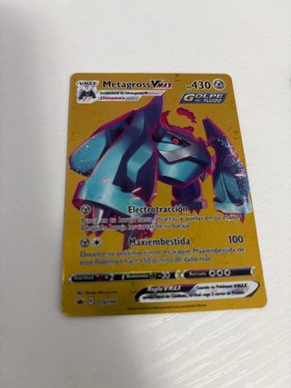 Carta Pokémon Metagross VMAX con acabado dorado. - Metagross VMAX - Ataque: Electrotracción - Ataque: Maxiembestida - Regla VMAX