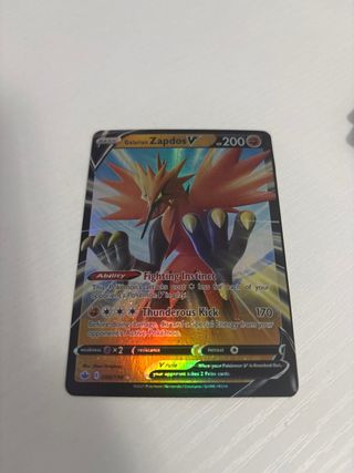 Carta Pokémon de Galarian Zapdos V. - Ataque: Thunderous Kick (170 de daño). - Habilidad: Fighting Instinct. - Debilidad: x2. - Resistencia: --. - Retirada: 1 energía. - Regla V: Tu oponente roba 2 cartas de premio cuando tu Pokémon V es Derrotado. - Código: 080/198.