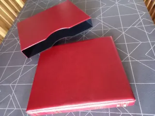 Álbum de tapa dura en color rojo/granate, para coleccionar monedas. Incluye caja protectora y 4 hojas para 36 monedas de tamaño 2 euros. La funda protectora torne un pequeño raspón en la parte inferior del lomo, de ahí el precio. - Material: Piel sintética. - Color: Rojo. - Incluye caja.