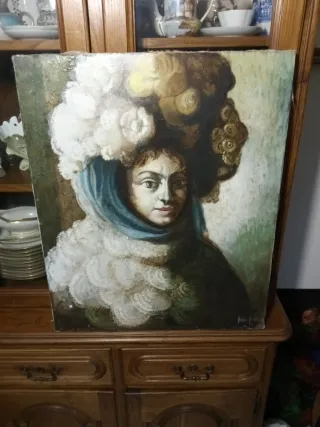 Obra de arte original del reconocido pintor Juan Gallardo Ariza. Un retrato cautivador con un estilo único. - Pintura al óleo sobre lienzo. - Representación de una figura femenina con un tocado exuberante. - Paleta de colores cálidos y terrosos.