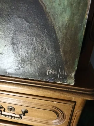 Cuadro de óleo sobre cartón con un marco decorado. - Marco con incrustaciones de concha. - Marco con detalles bonificados.