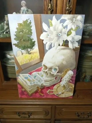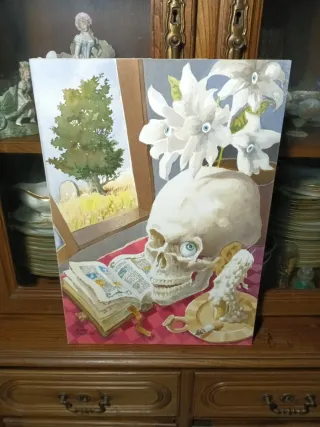 Obra original del artista Alberto Manrique. - Pintura de calavera con flores y libro. - Paisaje de cementerio al fondo.