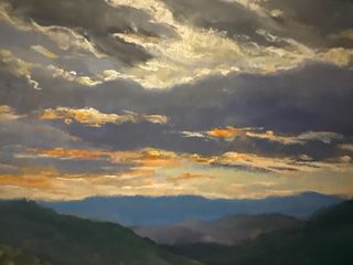 Pintura al óleo de un atardecer sobre montañas. La obra captura la belleza de la naturaleza al anochecer. - Medidas: 45x30 cm.