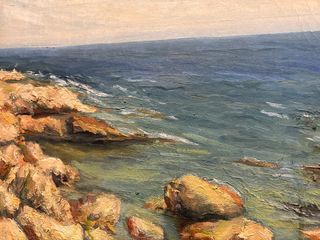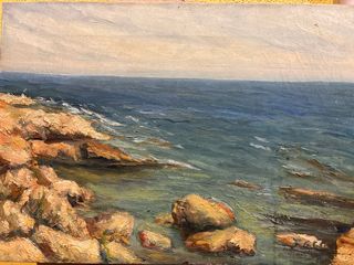 Pintura al óleo de la costa cántabra. Representa un paisaje marino con rocas y el mar. - Técnica: Óleo sobre lienzo. - Medidas: 50 x 34 cm.