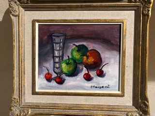 Pintura al óleo de un bodegón con frutas y un vaso. - Firmado por P. Margenat. - Medidas: 45x39 cm.