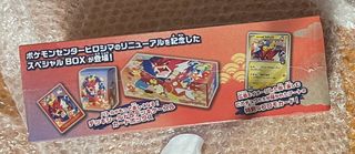 Este es el Special BOX conmemorativo por la renovación del Pokémon Center Hiroshima. - Incluye una carta promocional especial con arte de Pikachu. - Contiene un set de fundas para cartas y una caja para cartas. - El diseño presenta a Magikarp y Gyarados junto a Pikachu y otros Pokémon.