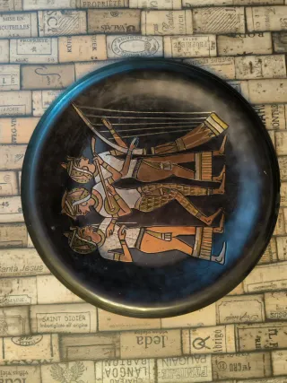 Plato decorativo con diseño inspirado en el arte egipcio. - Fabricado en metal. - Incluye gancho para colgar.