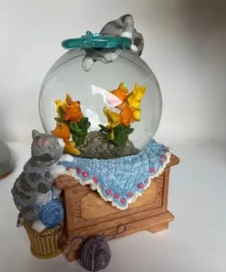 Bola musical NUEVA decorativa con un diseño encantador de gatos y peces. - Figuras detalladas de gatos y peces en su interior. - Base con diseño de mueble de madera y tejido de ganchillo. - Incluye ovillos de lana y cesta.Descatalogado