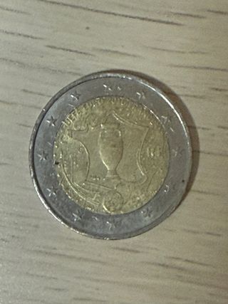 Moneda conmemorativa de 2 euros del Programa Mundial de Alimentos. Italia 2004. *circulada* - Diseño con espigas de trigo y maíz. - Año de emisión: 2004. - Bimetálica, con centro dorado y borde plateado. Cambio por otras que me interesen