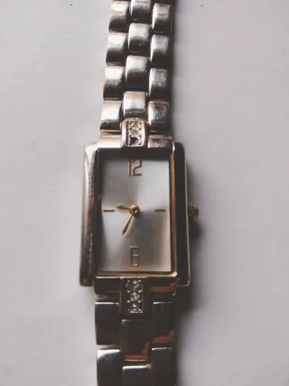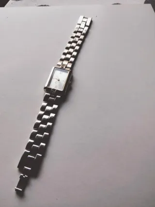 Elegante reloj de pulsera para mujer con esfera rectangular. -Funciona, pongo pila nueva en su venta. - Medidas de la esfera: 15mm x 20mm. - Pulsera de eslabones metálicos.