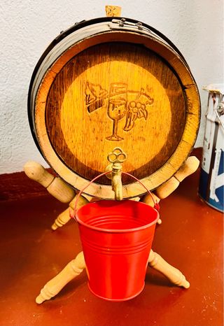 Barril decorativo de madera con su base. - Diseño rústico. - Ideal para decoración.