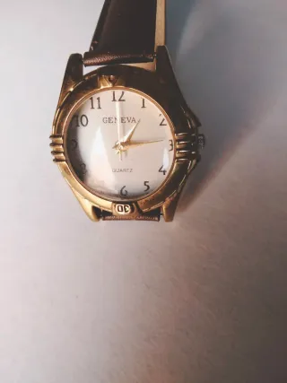 Reloj de pulsera Geneva con correa de piel. - Esfera con números arábigos. - Mecanismo de cuarzo. - Correa de piel marrón, Nueva. En su venta pongo pila nueva.