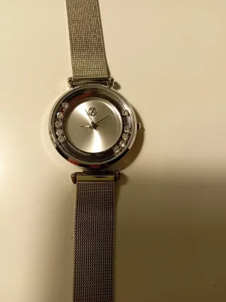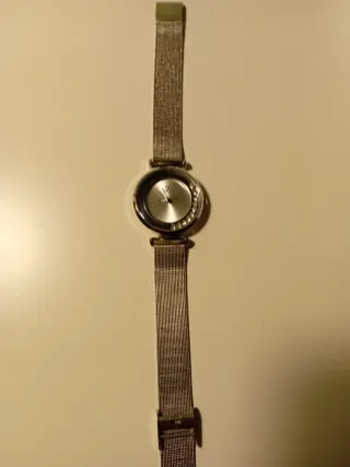 Elegante reloj de pulsera con correa de malla plateada. - Esfera redonda con detalles de pedrería. - Diseño moderno y sofisticado.