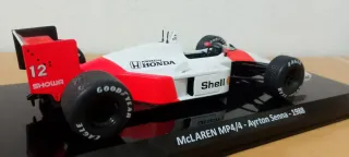 Réplica detallada del icónico coche de Fórmula 1 McLaren MP4/4, pilotado por Ayrton Senna en 1988. - Escala 1:24. - Diseño con los colores blanco, rojo y negro característicos. - Incluye patrocinadores como Honda, Shell y Goodyear. - Base expositora con el nombre del coche y el piloto.