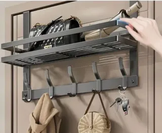 Estante de almacenamiento de pared con diseño moderno y funcional. - Acabado en color gris oscuro. - Dos niveles de estantería. - Cinco ganchos para colgar. - Ideal para organizar bolsos, llaves y otros accesorios. - dos tornillos con sus tuercas correspondientes