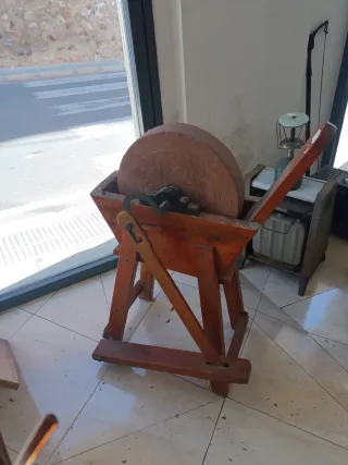 Moladora antigua con rueda de piedra. - Estructura de madera. - Mecanismo de molienda.
