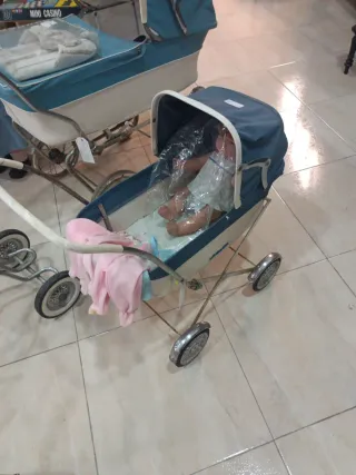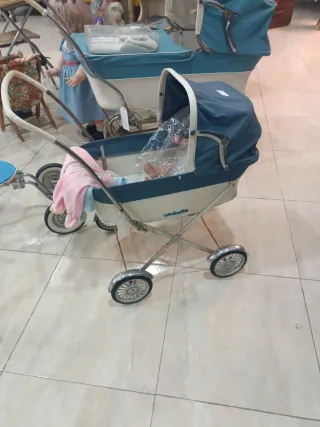 Precioso cochecito de muñecas de estilo vintage, de los años 60. Ideal para coleccionistas o para darle un toque retro a la decoración. - Diseño clásico en color azul y blanco. - Capota protectora. - Ruedas plateadas. - Incluye manta rosa.