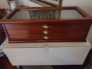Elegante expositor para guardar y exhibir estilográficas. - Tres cajones con divisiones. - Tiradores dorados. Medidas 38*19*12