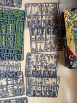 Caja de miniaturas de Perry Miniatures. - Batallón de Infantería Napoleónica Francesa. - Escala 28mm. - Material: Plástico duro. - Periodo: 1807-14. - Ilustración de portada por Peter Dennis.