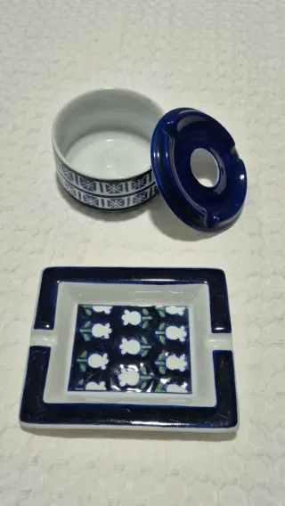 Conjunto de dos ceniceros de cerámica con un diseño distintivo. - Cenicero de agua redondo azul con detalles blancos. - Cenicero rectangular azul y blanco con estampado floral.