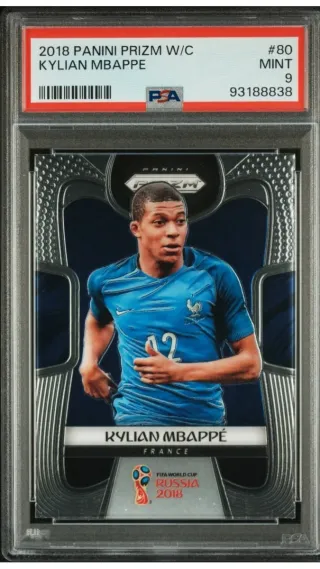 Tarjeta de Kylian Mbappé de la colección Panini Prizm World Cup 2018, clasificada por PSA con un Mint 9. - Tarjeta: 2018 Panini Prizm W/C - Jugador: Kylian Mbappé - Número de tarjeta: #80 - Grado PSA: Mint 9 - Número de certificación PSA: 93188838 - Evento: FIFA World Cup Russia 2018