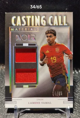 Tarjeta de colección Panini Casting Call de Lamine Yamal. - Edición limitada 34 de 65. - Incluye materiales de NOIR. - Jugador: Lamine Yamal. - Equipo: España.