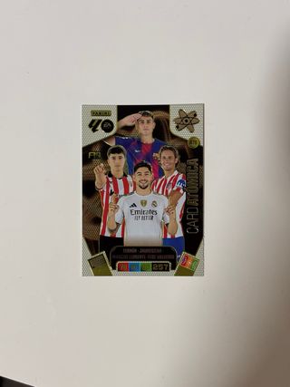 Carta de fútbol Panini Card Atomica. - Incluye a Fermín, Jauregiziar, Marcos Llorente y Fede Valverde. - Diseño con detalles dorados y atomica. - Número de carta 257.