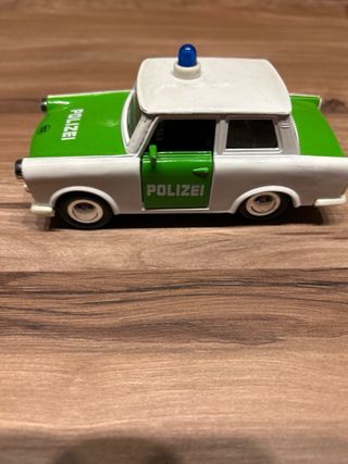 Maqueta de coche de policía antiguo. - Diseño clásico en color blanco y verde. - Detalle de sirena azul en el techo. - Inscripción POLIZEI en los laterales y capó.