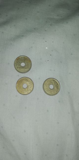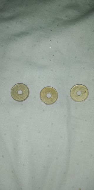 Conjunto de tres monedas antiguas con un diseño central perforado. - Monedas de colección. - Diseño conmemorativo. - Material metálico.