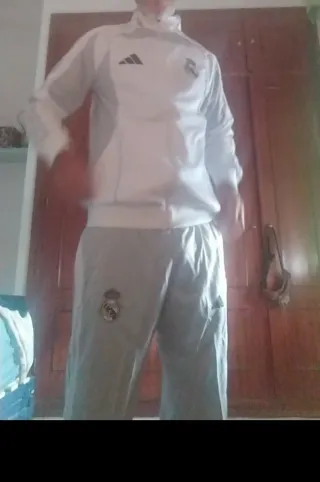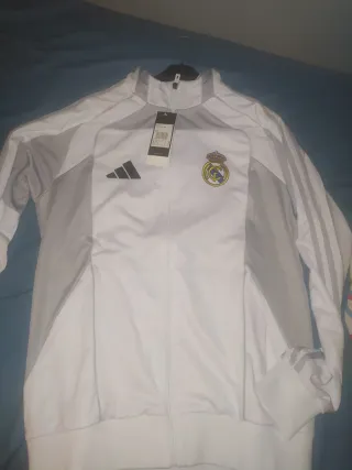 Chándal oficial del Real Madrid, temporada 2025, de la marca Adidas. - Diseño en blanco y gris. - Logo de Adidas y escudo del Real Madrid. - Tres rayas características de Adidas en las mangas.