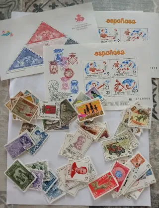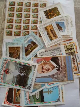 Colección de 400 sellos variados y hojas bloque de diferentes países y temáticas. - Incluye sellos de eventos como los Juegos Olímpicos de Múnich 72. - Hojas bloque con diseños de Concorde y WIPA '81. - Diversos sellos de Polonia, España y Ajman. De España hay 70 sellos, muchos nuevos. - Algunos sellos muestran arte clásico y figuras históricas. Más sellos en mi perfil.