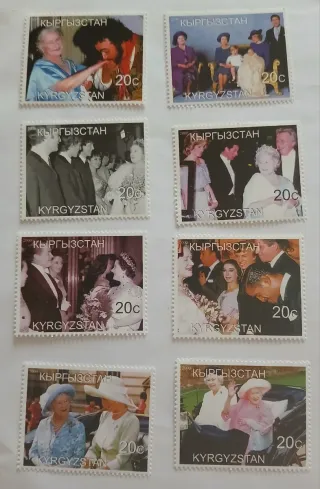 Conjunto de sellos de Kirguistán conmemorando a la Reina Isabel II del Reino Unido. - Cada sello tiene un valor de 20c. - Imágenes de eventos reales y retratos de la Reina. Más sellos en mi perfil.