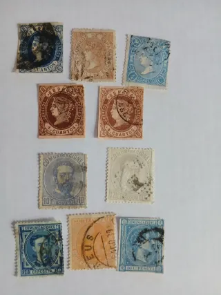 Conjunto de 10 sellos antiguos de España. - Sellos de Isabel II, de Amadeo de Saboya y de Alfonso XII. Más sellos en mi perfil.
