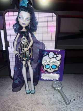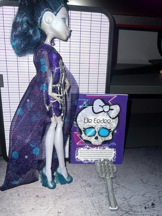 Muñeca Monster High Elle Eedee, primera generación. - Cabello azul oscuro con mechones morados. - Vestido negro con detalles plateados y azules. - Capa morada con estampado de circuitos. - Incluye su libro de personaje.