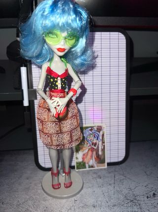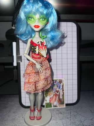 Muñeca Ghoulia Yelps de la colección Skull Shores, Generación 1. - Pelo azul vibrante. - Gafas verdes de gran tamaño. - Vestido de verano con estampado. - Sandalias rosas de tacón.