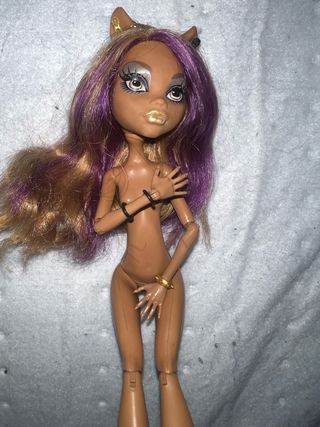 Muñeca Clawdeen Wolf de la colección 13 Wishes de Monster High. - Pelo largo con mechas moradas y doradas. - Maquillaje con sombras plateadas y labios dorados. - Orejas de lobo. - Brazaletes negros y dorados.
