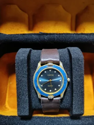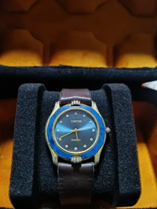 Elegante reloj con movimiento de cuarzo y esfera azul. Un accesorio clásico con un toque de brillo. - Bisel octogonal con detalles en azul. - Marcadores de hora con pequeños diamantes. - Correa de piel marrón. - Caja de reloj incluida.