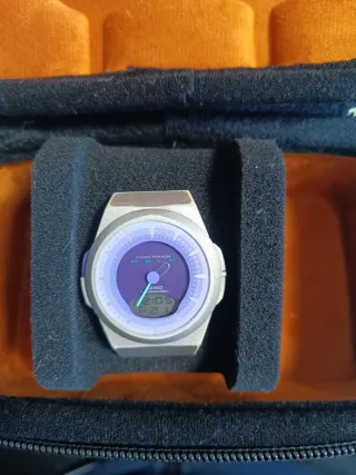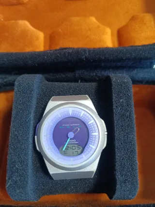 Reloj Casio con diseño analógico y digital en tonos morados y plateados. - Esfera con manecillas y pantalla digital. - Bisel plateado. - Correa de color morado.