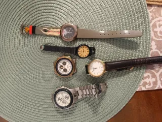 Conjunto de cinco relojes de pulsera con diferentes estilos y correas. - Reloj con correa de cuero marrón y esfera blanca. - Reloj con correa de cuero negro y esfera dorada. - Reloj con correa de tela y esfera con diseño de pluma. - Reloj deportivo con correa metálica y múltiples esferas. - Reloj con correa metálica y esfera blanca.
