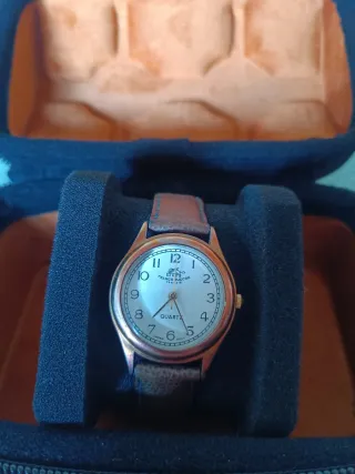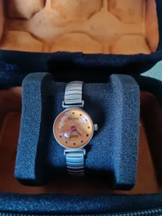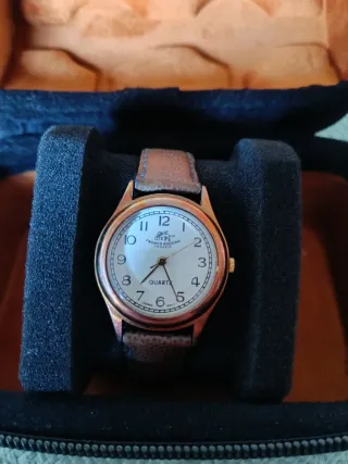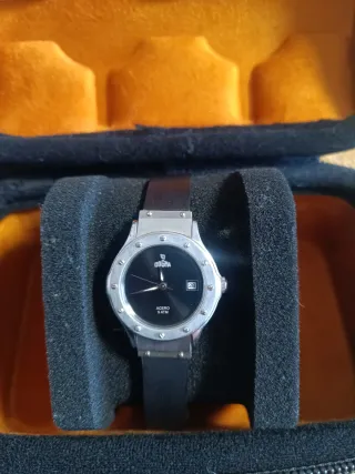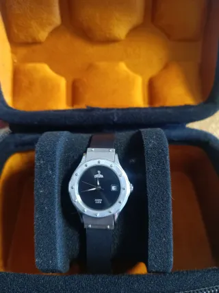 Reloj de pulsera Diamant con correa de cuero. - Esfera negra con detalles en naranja y verde. - Ventana de fecha. - Movimiento de 17 rubíes. - Protección antichoque.