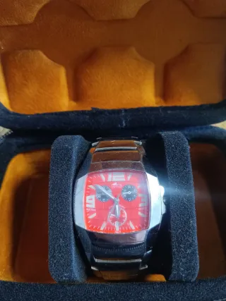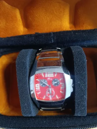 Reloj de pulsera Lotus con esfera roja y detalles plateados. - Diseño deportivo con cronógrafo. - Correa de metal. - Resistente al agua 100M. Algún arañazo del uso.