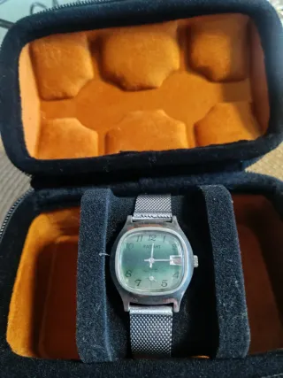 Reloj de pulsera para mujer de la marca Radiant. Presenta una esfera de color verde y una correa de malla metálica. - Esfera cuadrada. - Correa de malla plateada. Necesita servicio.