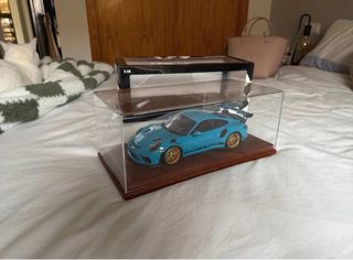 Réplica detallada del Porsche 911 GT3 RS a escala 1/18. Edición limitada a 330 unidades. Color azul sin capo de carbono dificil de encontrar De la marca Minichamps, trae la caja original también La caja acrilica tiene una base de cuero color marron oscuro, extra de 40€ Se envia bien protegido