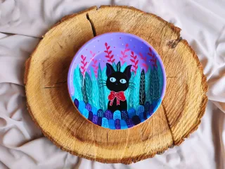 Plato decorativo pintado a mano con un diseño de gato negro. - Fondo morado con detalles de plantas. - Gato negro con lazo rojo.