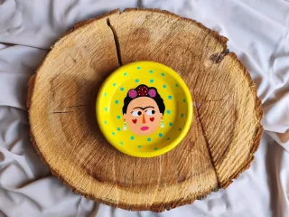 Plato decorativo con un diseño inspirado en Frida Kahlo. Ideal para añadir un toque artístico a tu hogar. - Base amarilla con lunares azules. - Rostro de Frida pintado en el centro. - Adornos florales en la cabeza y pendientes. - Corazones y detalles en las mejillas.