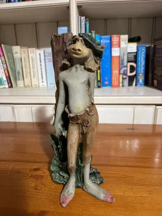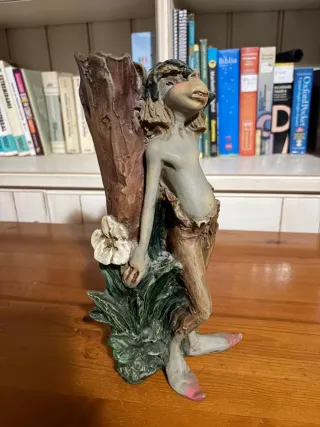 Figura decorativa con un diseño único y detallado. - Representa a una criatura fantástica, posiblemente un duende o hada. - Base con elementos naturales como hojas y ramas. - Acabado en tonos tierra y verdosos.