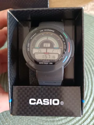 Reloj Casio modelo Tri Chrono con correa negra. - Resistente al agua 100M. - Pantalla digital. - Funciones de cronómetro y temporizador. Nuevo, garantía desde el 18/02/2026